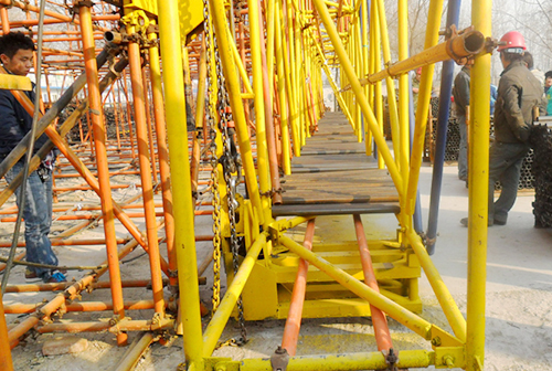 6)吊套式全鋼附著式升降腳手架。即采用吊拉式附著支承的、架體可沿套框升降的附著升降腳手架;